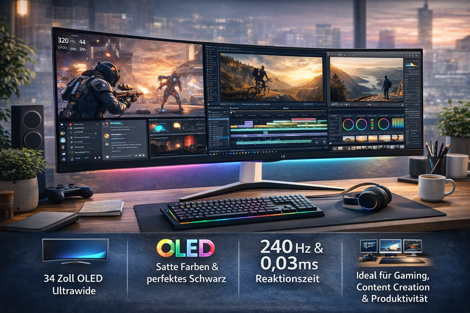 Mit dem LG UltraGear 34GX90SA-W bringt LG einen 34 Zoll großen OLED-Monitor auf den Markt, der genau diesen Anspruch verfolgt. Er richtet sich an Nutzer, die keine halben Lösungen suchen, sondern ein kompromissloses Gesamtpaket aus Bildqualität, Performance und Arbeitsfläche erwarten. In diesem ausführlichen ROOM-Testbericht analysieren wir den Monitor im Detail, von Design und Verarbeitung über Gaming-Performance bis hin zur Alltagstauglichkeit im professionellen Einsatz.